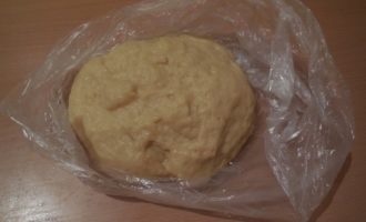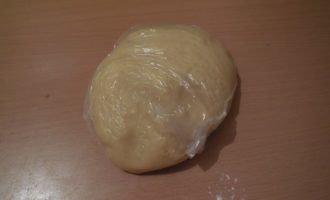 Rol het deeg tot een bal, druk het met de hand plat, wikkel het in plasticfolie en leg het 30 minuten in de vriezer. Dit wordt gedaan zodat het deeg sneller en gelijkmatiger afkoelt en er gemakkelijk mee te werken is.