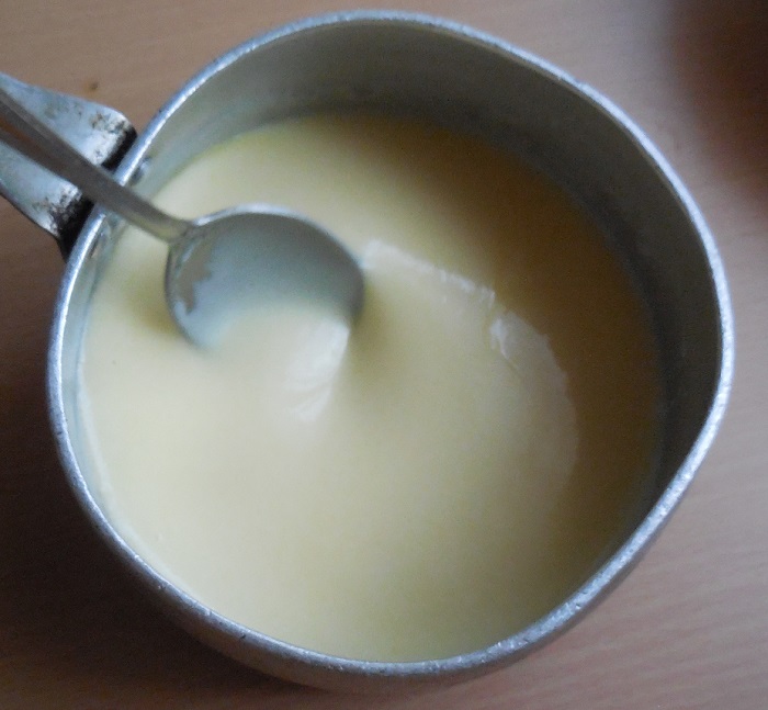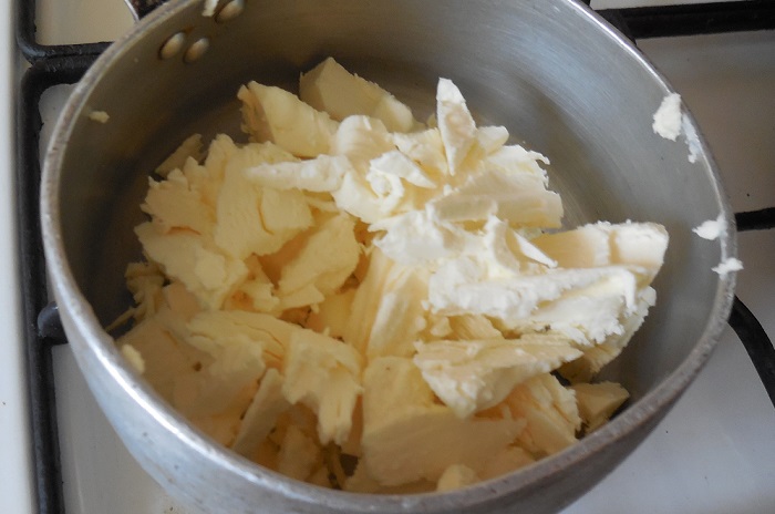 - Smelt boter in een pan, voeg daar gekookte gecondenseerde melk toe en blijf verwarmen.