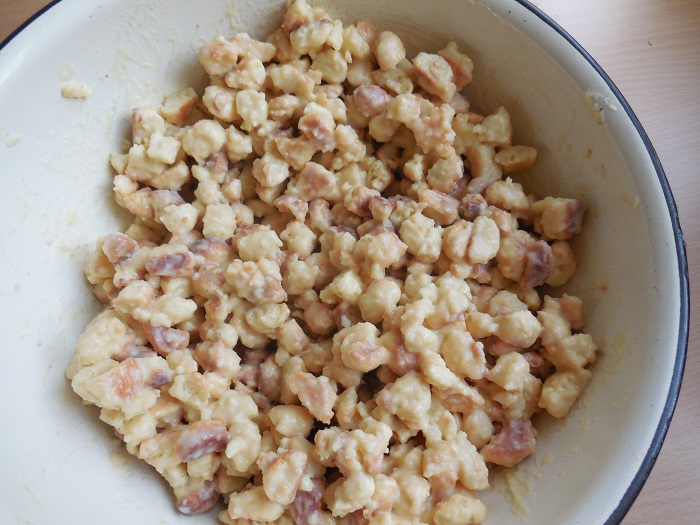 Nadat het deeg is afgekoeld, breek je de bolletjes van het deeg met je handen in kleine stukjes en giet je ze in een diepe kom. Giet alle room in dezelfde kom en meng dit met de zandkruimels.