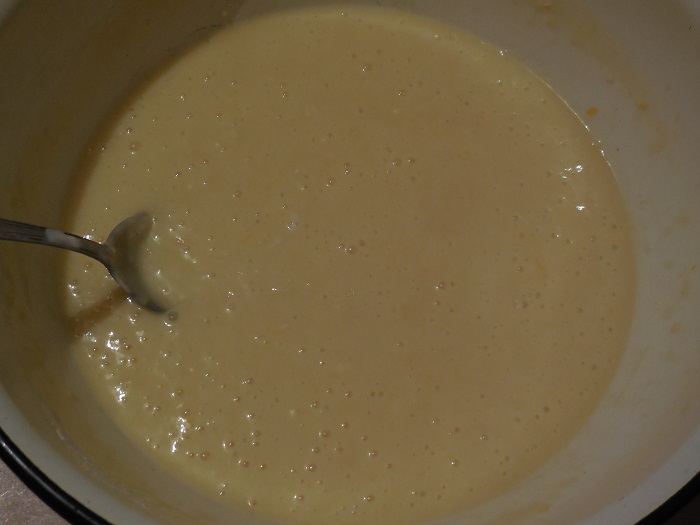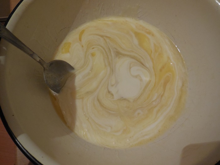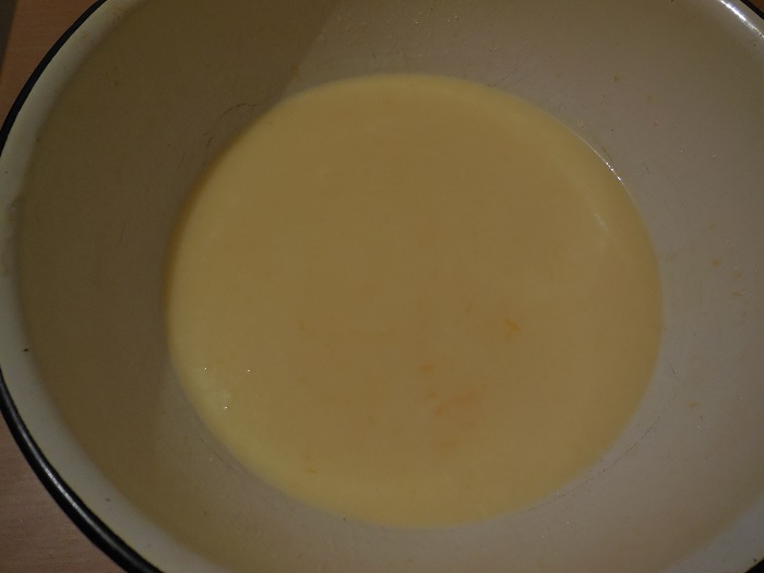 - Giet melk en gesmolten boter bij het eimengsel, roer tot een glad mengsel.