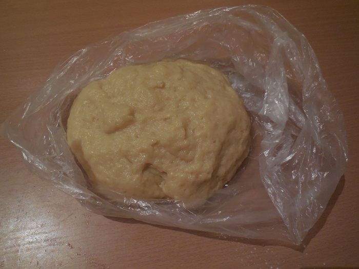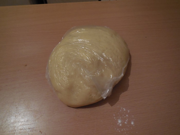 Rol het deeg tot een bal, druk het met de hand plat, wikkel het in plasticfolie en leg het 30 minuten in de vriezer. Dit wordt gedaan zodat het deeg sneller en gelijkmatiger afkoelt en er gemakkelijk mee te werken is.