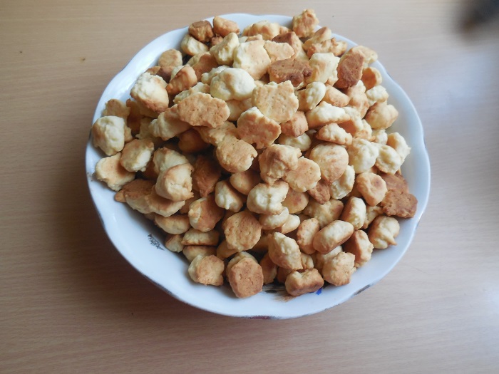 - Bak ongeveer 15 minuten op de aangegeven temperatuur. tot rossig en goudbruin, eruit halen, afkoelen. Breek het deeg met je handen in kleine stukjes.