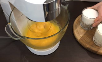 - We rijden eieren in het mengsel, mengen, voegen dan bloem toe en kloppen het deeg opnieuw met een mixer.