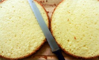 - We zetten in de oven en bakken gedurende 15-20 minuten. Snijd de afgewerkte cake in 2 delen. Elke cake moet 1,5 - 2 cm dik zijn.