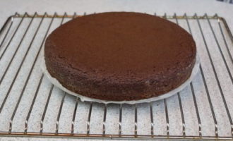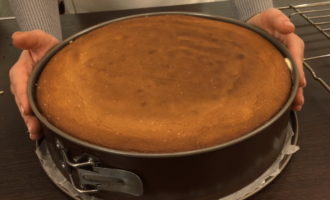 - Haal de afgewerkte cake uit de vorm, laat hem afkoelen en halveer hem in de lengte tot twee identieke biscuitcakes.