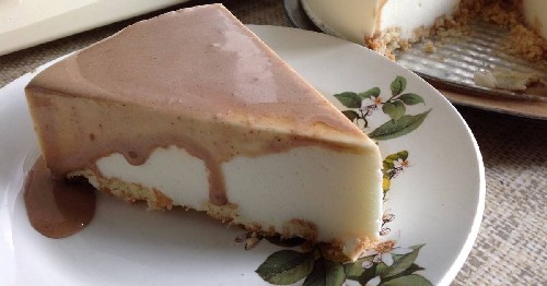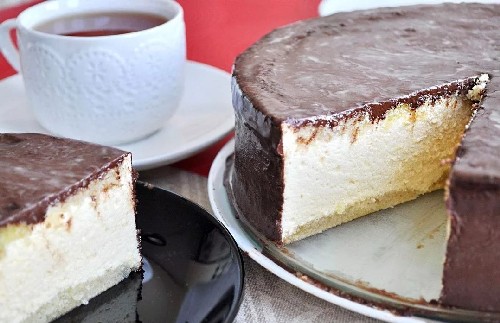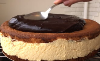 - Doe het biscuitgebak, ingevet met glazuur, opnieuw in de vorm, giet de afgewerkte soufflé uit en egaliseer hem. Giet het resterende glazuur erop. We zetten de cake 2-3 uur in de koelkast.