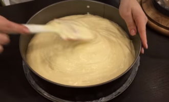 Nu nemen we de ovenschaal. We leggen speciaal papier op de bodem, waarop we het deeg gieten en egaliseren volgens de diameter van de vorm.