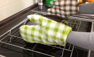 We zetten het formulier in de oven. We zullen de cake ongeveer 20 minuten bakken, de temperatuur moet 200 graden zijn.