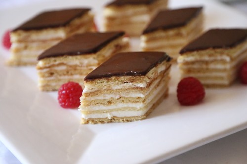- We smeren een cake en smeren deze goed in met een deel van de room.Bedek het met een tweede cake en smeer het opnieuw in met room. Dit doen we bij alle taarten. We zetten 5-6 uur in de koelkast.
