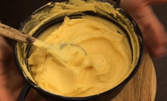 - Combineer boter met gecondenseerde melk en klop met een mixer op maximale snelheid. Combineer de massa met eiwitten, klop tot een gladde massa en vorm een soufflé.