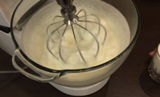 Klop de eiwitten met een mixer in een aparte kom. Voeg suiker, vanilline toe en voeg vervolgens gelatine toe. En we blijven roeren.