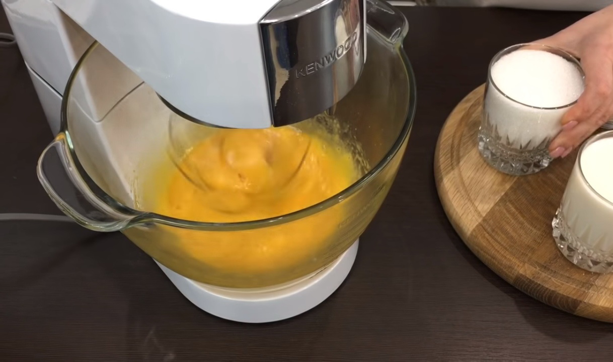 - We rijden eieren in het mengsel, mengen, voegen dan bloem toe en kloppen het deeg opnieuw met een mixer.