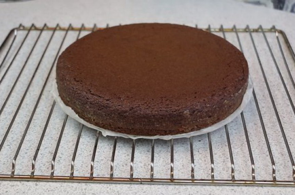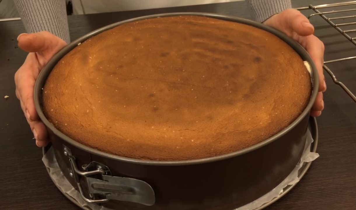 - Haal de afgewerkte cake uit de vorm, laat hem afkoelen en halveer hem in de lengte tot twee identieke biscuitcakes.