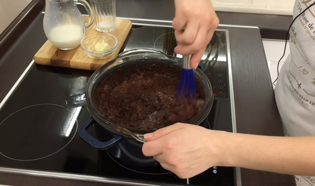 - Doe chocolade, melk, cacao en boter in een pan. We sturen het naar de kachel, roeren tot een homogeen glazuur is gevormd.