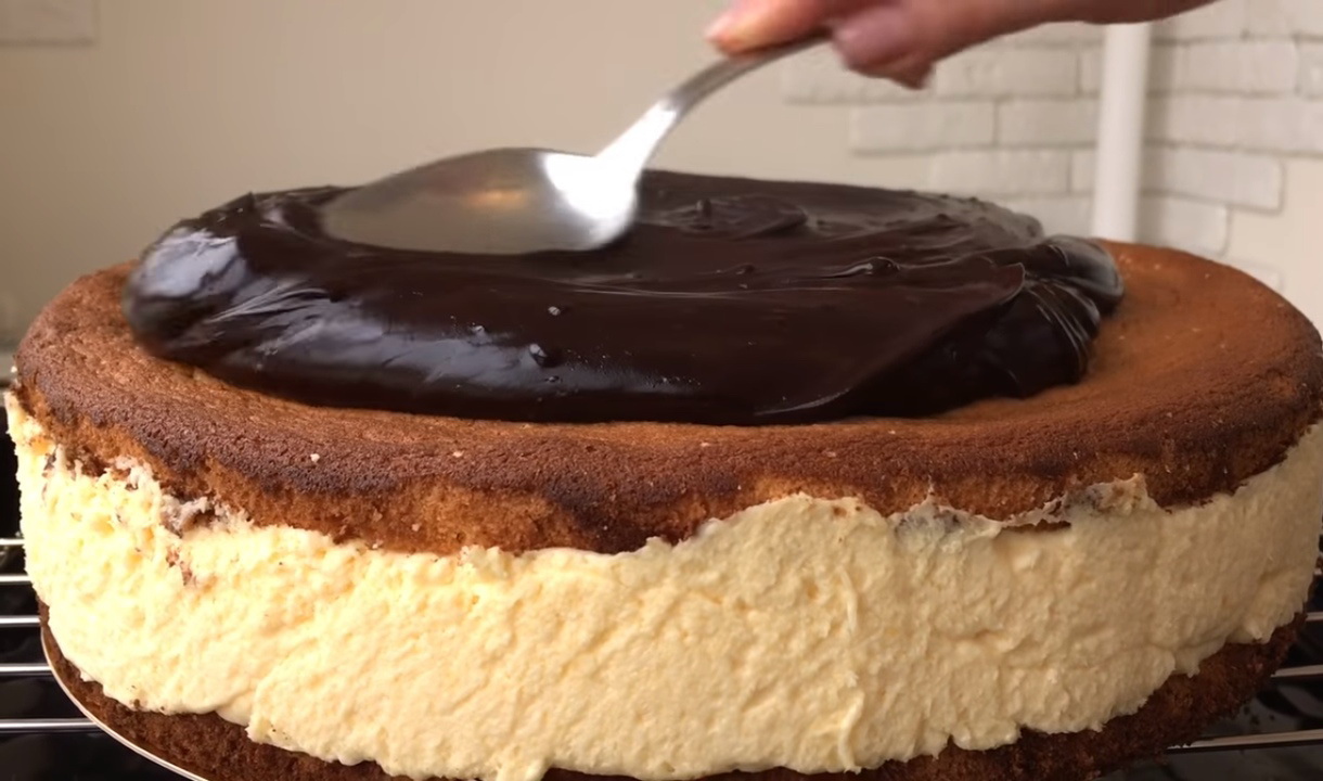 - Doe het biscuitgebak, ingevet met glazuur, opnieuw in de vorm, giet de afgewerkte soufflé uit en egaliseer hem. Giet het resterende glazuur erop. We zetten de cake 2-3 uur in de koelkast.