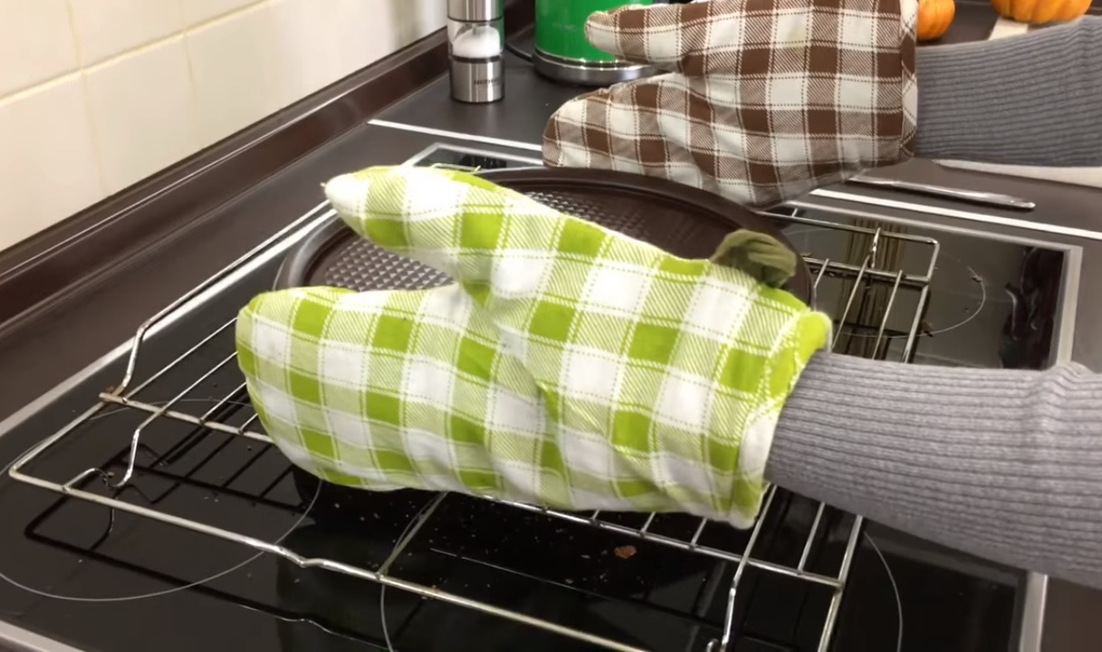 Als de cake gebakken is, haal je hem uit de vorm en verwijder je de aanhangende stukjes papier.
