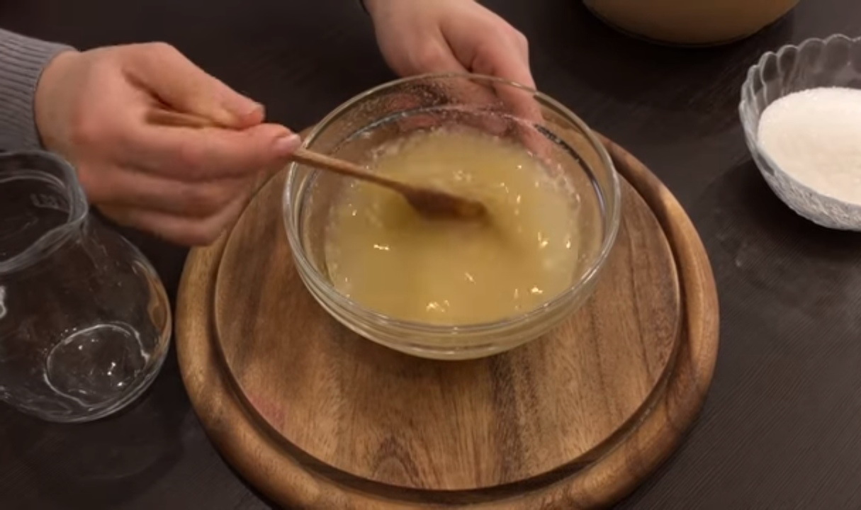 - We combineren water met gelatine, wachten 20 minuten totdat het opzwelt. Dan zetten we op het fornuis en houden het vuur totdat de gelatine oplost. Wij koelen het af.