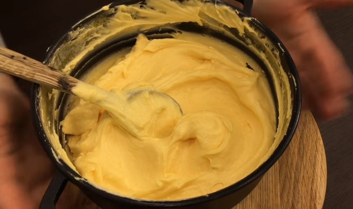 - Combineer boter met gecondenseerde melk en klop met een mixer op maximale snelheid. Combineer de massa met eiwitten, klop tot een gladde massa en vorm een soufflé.
