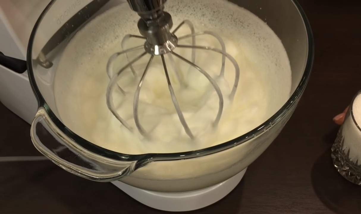 - Klop de eiwitten met een mixer tot dik schuim.