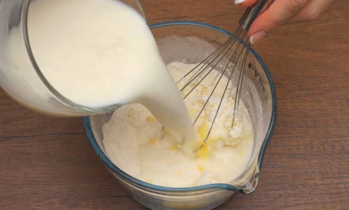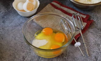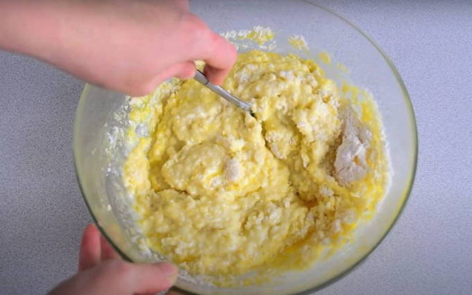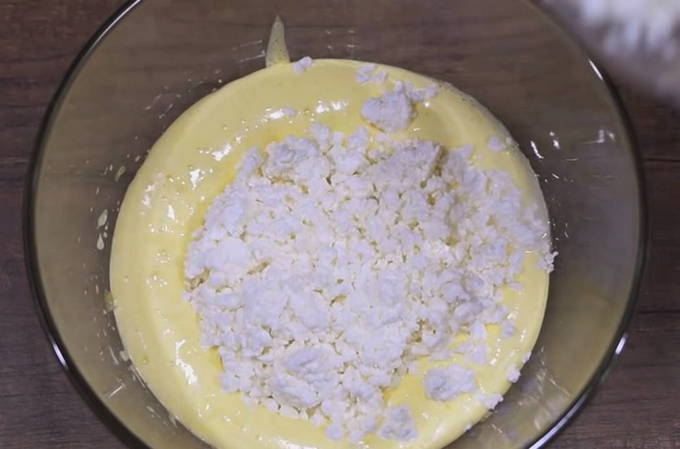 - Klop de eieren met een mixer en voeg geleidelijk suiker toe gedurende twee minuten. Voeg geraspte kwark, zout, frisdrank toe en blijf kloppen.
