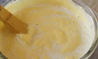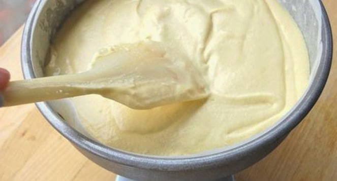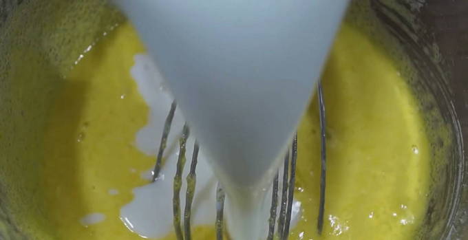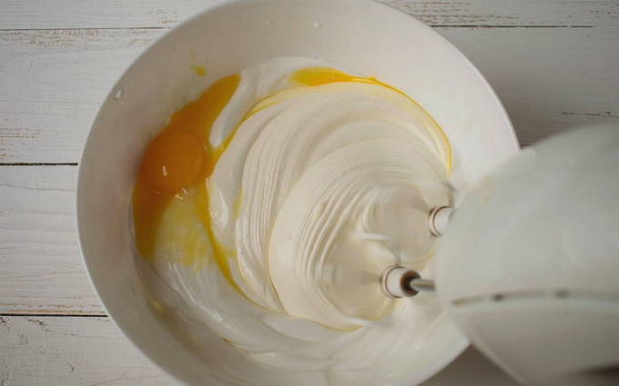 - Introduceer de dooiers in de resulterende massa en klop een minuut op lage snelheid. Het is belangrijk dat de eerder opgeklopte eiwitten niet bezinken.