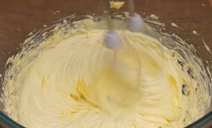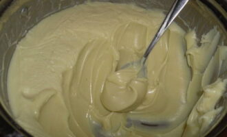- Klop de zachte boter luchtig en meng geleidelijk met het melk-chocolademengsel. Het resultaat is een zeer lichte en luchtige crème met een gladde textuur. Om te voorkomen dat de crème uithardt, haasten we ons naar de volgende fase.