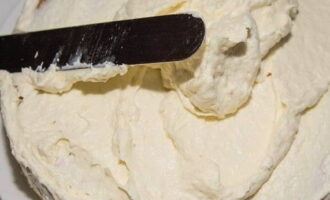 - Om de room te bereiden, hebben we mascarpone-kaas en gecondenseerde melk op kamertemperatuur nodig. Combineer de twee componenten samen en klop met een mixer tot een luchtige massa is verkregen. Vervolgens brengen we het over naar een spuitzak en sturen het ook naar de koelkast.