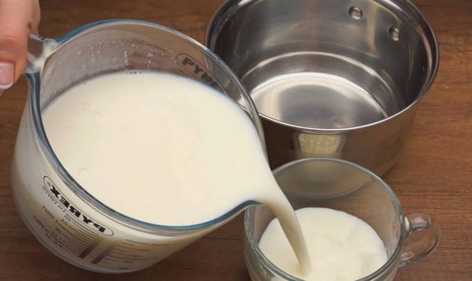 - Verdeel de melk in twee delen van elk 300 en 700 ml. We sturen het meeste naar middelhoog vuur en brengen aan de kook.