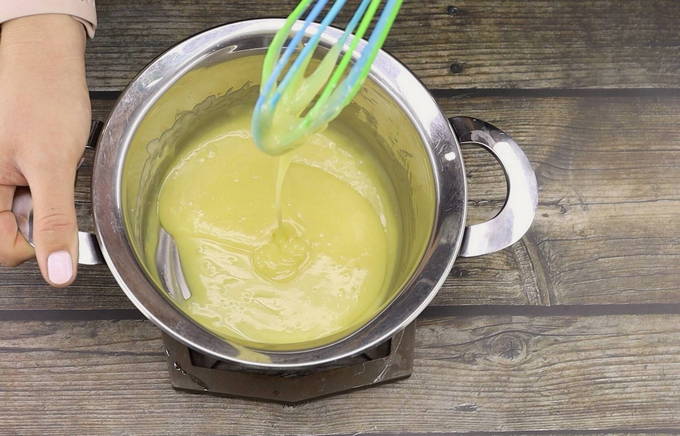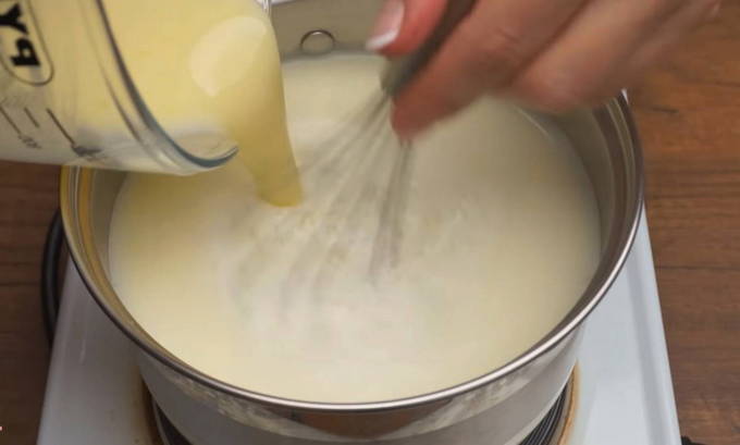 - Laten we verder gaan met het bereiden van de room: klop in een kom eieren, kristalsuiker en vanillesuiker. Giet de door een zeef gezeefde bloem erbij en blijf goed mengen. Giet melk bij het mengsel en stuur het naar een pan op laag vuur. Onder voortdurend roeren, aan de kook brengen. Haal van het vuur en laat afkoelen.