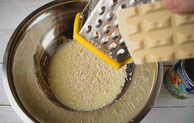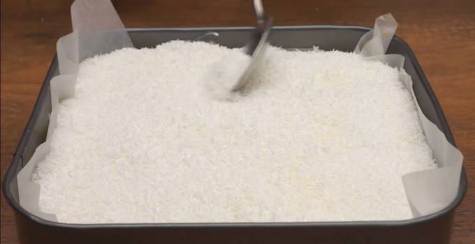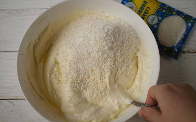 - Voeg kokosvlokken toe tot een homogene massa, meng voorzichtig en giet in een voorbereide ovenschaal.