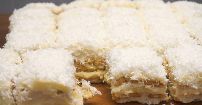 - We gaan ook door met het één voor één opmaken van de lagen totdat we alle cookies hebben gebruikt. Bestrooi de bovenste laag royaal met kokos. We laten het afgewerkte dessert twee uur in de koelkast staan.