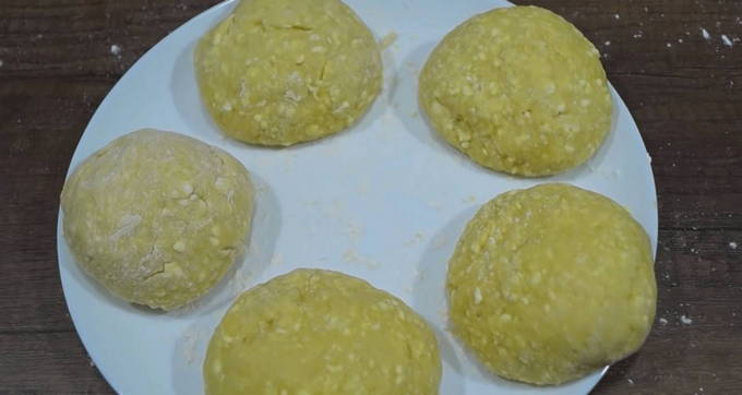 - Zodra de massa homogeen wordt, de gezeefde bloem in porties toevoegen. Meng goed met een lepel. We verdelen het deeg in vijf gelijke delen, vormen zes ballen en sturen het in deze vorm een uur in de koelkast.