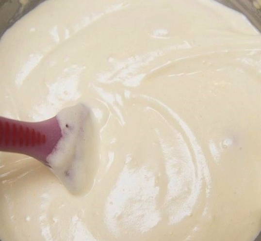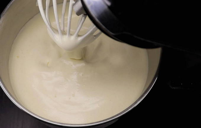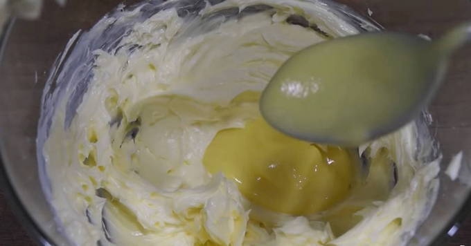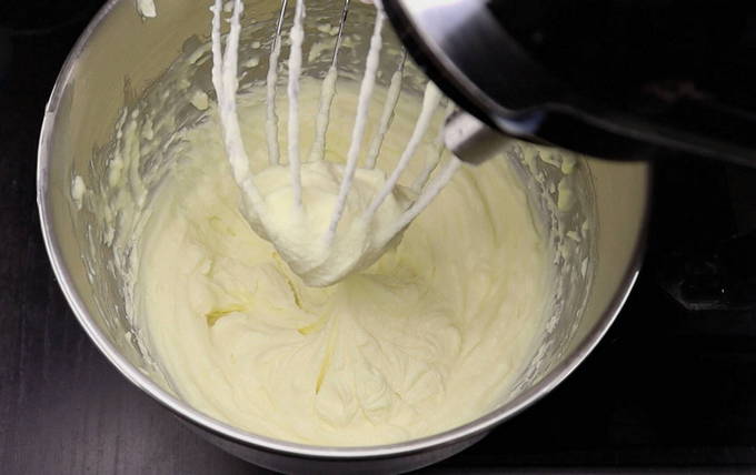 - Voeg geleidelijk gecondenseerde melk toe aan de roomkaas en klop tot een gladde massa.