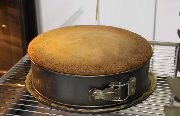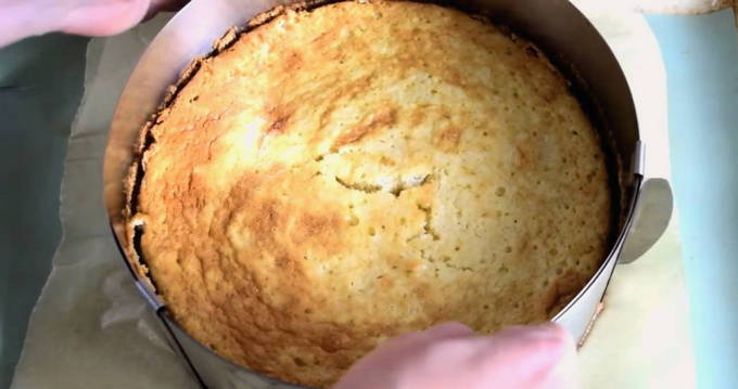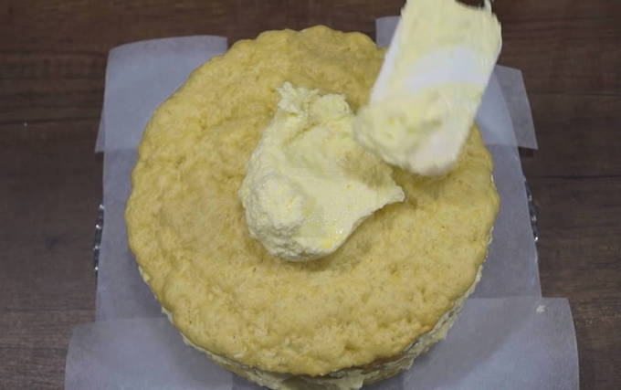 Vet de bodem en de randen van de vorm in met boter, dek af met bakpapier en vul met deeg. We bakken de taarten 40 minuten in een voorverwarmde oven op 180 graden. Gedurende deze tijd moet het koekje de tijd hebben om te rijzen en bruin te worden. Laat het koekje afkoelen, wikkel het dan in plasticfolie en laat het een nacht in de koelkast staan. 's Morgens nemen we een koekje en verdelen het in de lengte in drie gelijke delen. Het is raadzaam om een speciaal mes te gebruiken om het koekje te snijden, zodat de cakes niet versnipperen.