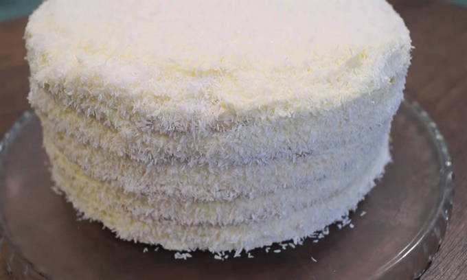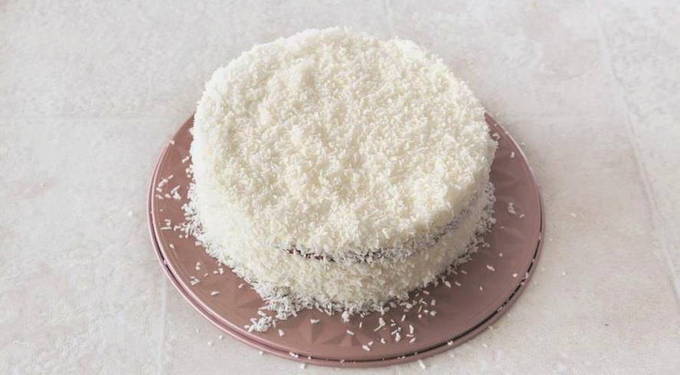 - Breng de crème aan rond de hele omtrek van de cake en egaliseer deze met een spatel of een groot mes. Bestrooi rijkelijk met kokos. Als je wilt, kun je versieren met noten, chocolade of Rafaello-snoepjes.