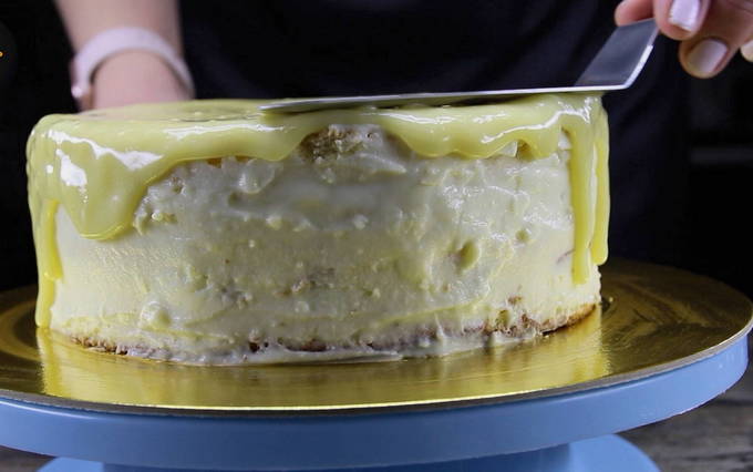 - De meest geduldigen bereikten de laatste fase. Verwijder de huishoudfolie en vet de cake van alle kanten in met de resterende room. Giet het afgekoelde glazuur over de cake. Bestrooi de bovenkant met veel kokos. Het is raadzaam om een uur in de koelkast te laten staan totdat het glazuur hard wordt.