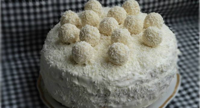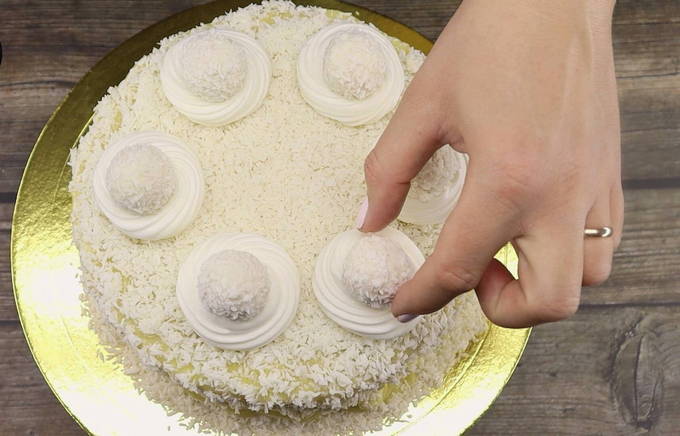 Nadat de cake 4-5 uur is afgekoeld, kun je beginnen met decoreren. Bestrooi traditioneel met kokos en versier met kleine Rafaello-snoepjes. De taart is klaar.