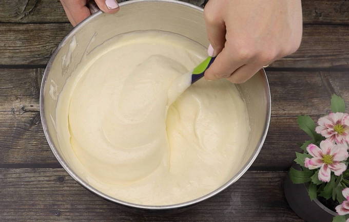 - Voeg langzaam eiwitten toe aan het deeg en probeer van boven naar beneden te mengen.