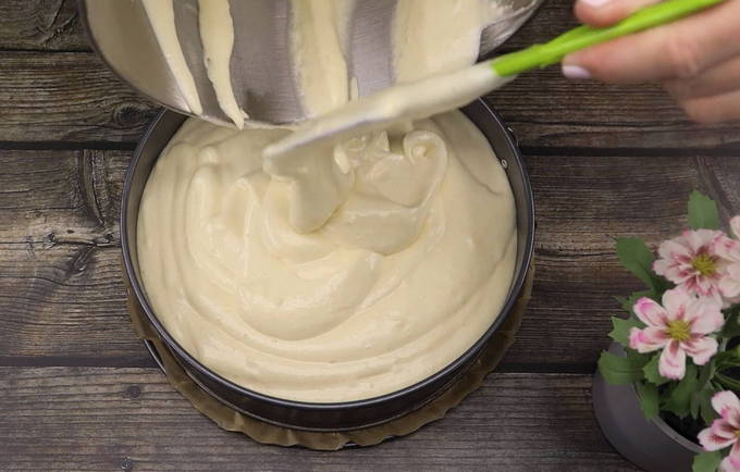 Tegelijkertijd bereiden we de crème voor. We mengen zure room, kristalsuiker, ei, vanilline en bloem. We sturen het mengsel naar een waterbad en brengen het om te verdikken, en niet te vergeten te roeren. Hieraan voegen we gehakte witte chocoladereep, kokosvlokken en zachte boter toe. De massa wordt verkregen met een romige structuur. We laten het ook een nacht in de koelkast staan.