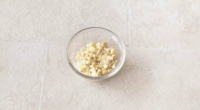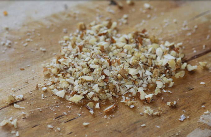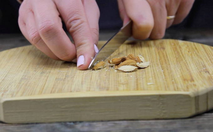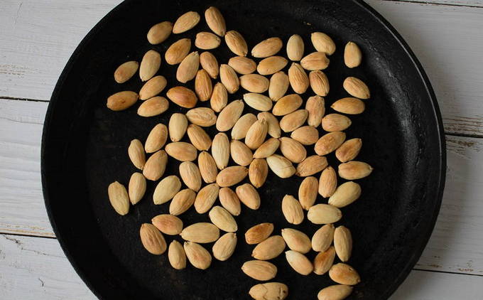 - Voor het bakken van de amandelen de noten met water vullen en op laag vuur aan de kook brengen. Daarna laten we het drie minuten staan en spoelen we later af met koud water. Verwijder het omhulsel, droog het en giet het in een droge koekenpan. Bak vijf minuten en hak grof.