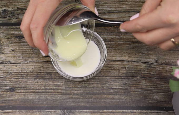 - Om de cakes te laten weken, voegt u gewone melk toe aan de gecondenseerde melk en mengt u goed.
