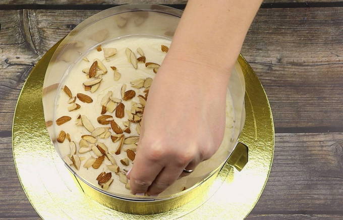 - We verspreiden de eerste cake, gieten met impregnatie en bedekken met mascarponecrème. Bestrooi met gehakte amandelen en bedek met een andere cake, stevig aan elkaar vastgemaakt. We herhalen dezelfde acties als bij de eerste cake. We sturen de geweekte en romige cake minimaal drie uur naar de koelkast.