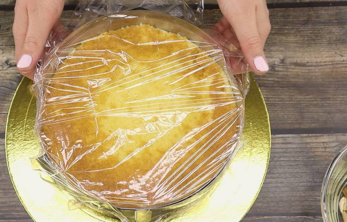 - Wikkel de cake in huishoudfolie en laat hem minimaal drie uur afkoelen.