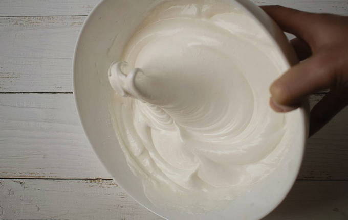 - Klop de blanken afzonderlijk samen met een snufje zout, eerst tot een licht schuim ontstaat en vervolgens tot een dichter schuim, waarbij geleidelijk kristalsuiker wordt toegevoegd. Het eiwitschuim moet zacht en stabiel van consistentie zijn.