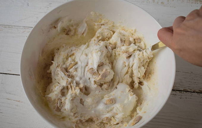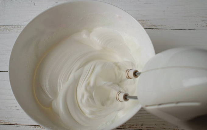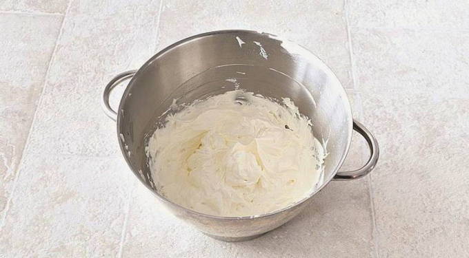 - Klop voor de room de zachte roomkaas los en voeg dan het blikje gecondenseerde melk toe. Stop niet met kloppen met een mixer totdat er een luchtige massa is gevormd.