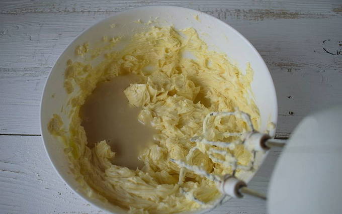 - Terwijl de afgewerkte room bij kamertemperatuur afkoelt, klop je de zachte boter met een mixer tot wit en voeg je geleidelijk aan de afgekoelde room toe. Meng alles grondig.