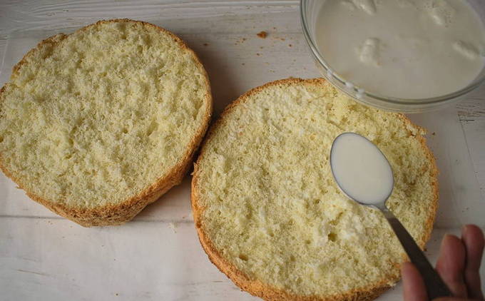 Giet de cakes met melkimpregnatie, waarvoor we 2 eetlepels suiker oplossen in 50 ml melk. Vet de cakes vervolgens in met room en verbind ze met elkaar.