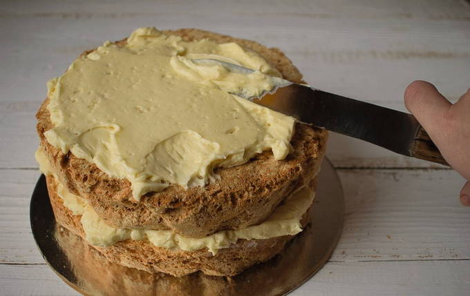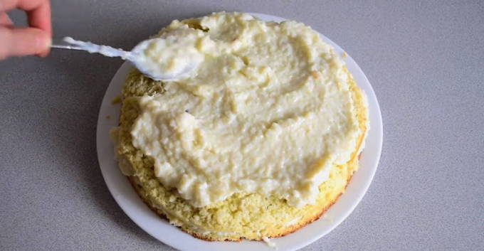 - Kook de room tot hij dik is en vergeet niet te roeren. Tegelijkertijd verdelen we de afgekoelde cakes in een paar gelijke delen in dikte en bedekken met vla.