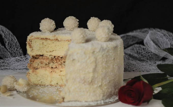 We verdunnen het klassieke recept voor Raffaello kokoscake met een laagje licht, zoals lucht, en knapperige meringue met een uitgesproken smaak van amandel. Een botercrème op basis van witte chocolade en gecondenseerde melk focust op de oude melkachtige zoetheid van het dessert, die een aangename afdronk achterlaat.