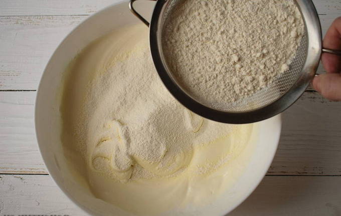 - Zeef bloem en vanilline in dezelfde kom door een zeef. Meng het deeg grondig met lichte lepelbewegingen van onder naar boven.